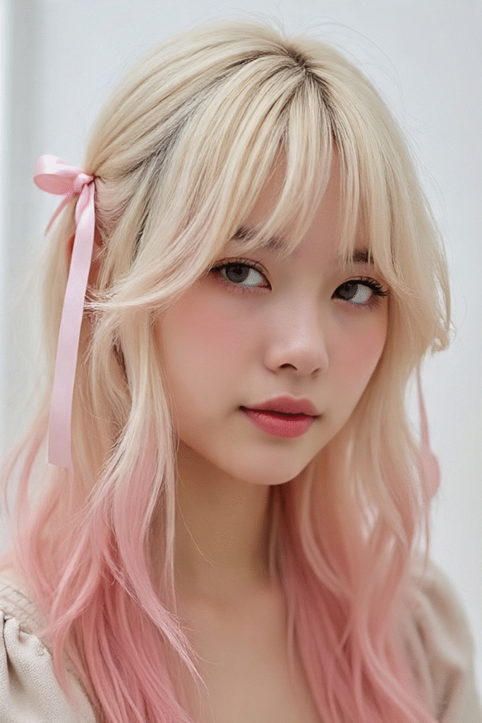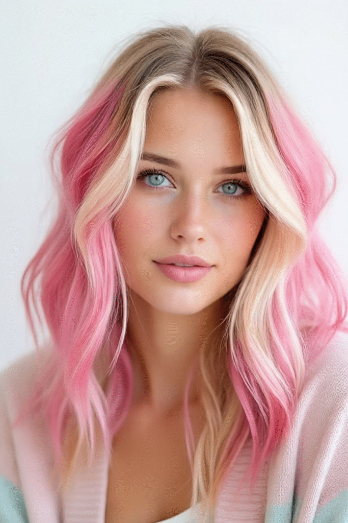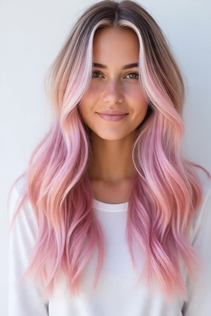 Dieser raffinierte Ansatz für rosa Haare kombiniert eine cremige blonde Basis mit zarten pastellrosa Strähnen, die das Gesicht wunderschön umrahmen. Die Technik funktioniert außergewöhnlich gut bei langen, stufigen Haarschnitten mit Vorhang-Ponys und erzeugt einen sanften, romantischen Effekt, der perfekt für diejenigen ist, die mit Farbe experimentieren möchten, ohne zu gewagt zu werden.