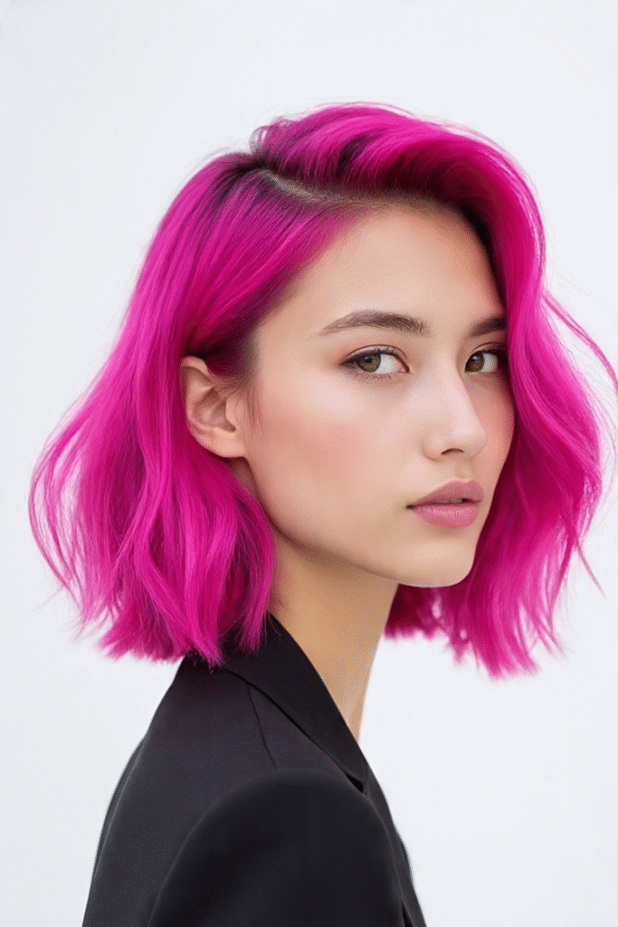 Ein gewinkelter Bob bietet die perfekte Leinwand für Fuchsia-Hervorhebungen, die fantastischen Kontrast zu einer dunkleren Basis schaffen. Die geometrischen Linien des Schnitts betonen die Farbplatzierung und schaffen einen modernen, raffinierten Look, der sowohl kantig als auch feminin ist.