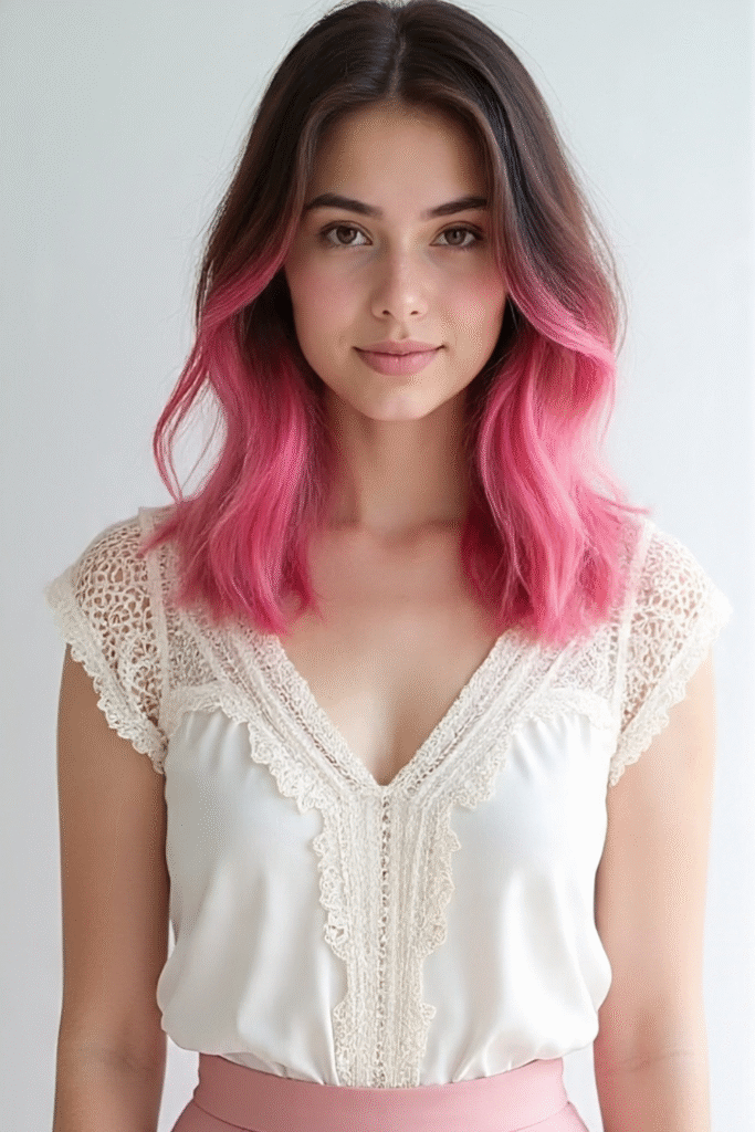 Dieser Stil funktioniert besonders gut für diejenigen mit dunklerem Naturhaar, die mit Rosa experimentieren möchten, ohne ihren ganzen Kopf zu bleichen. Es ist ein mutiger, aber tragbarer Ansatz für Farbexperimente.