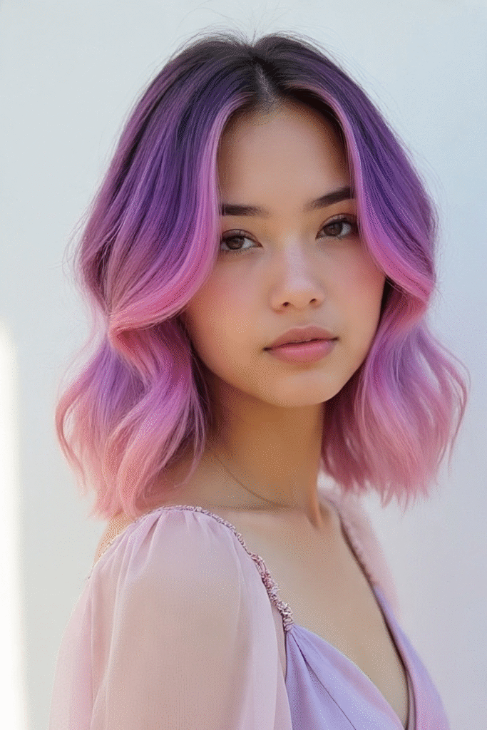 Diese süße Frisur zeigt, wie Lila und Pastellrosa fantastisch zusammenschmelzen können, sogar bei mittellangem Haar. Der Farbverlauf-Effekt fließt von dunklen Ansätzen zu hellen Spitzen und erzeugt einen schönen Gradienten, der sowohl romantisch als auch modern ist.