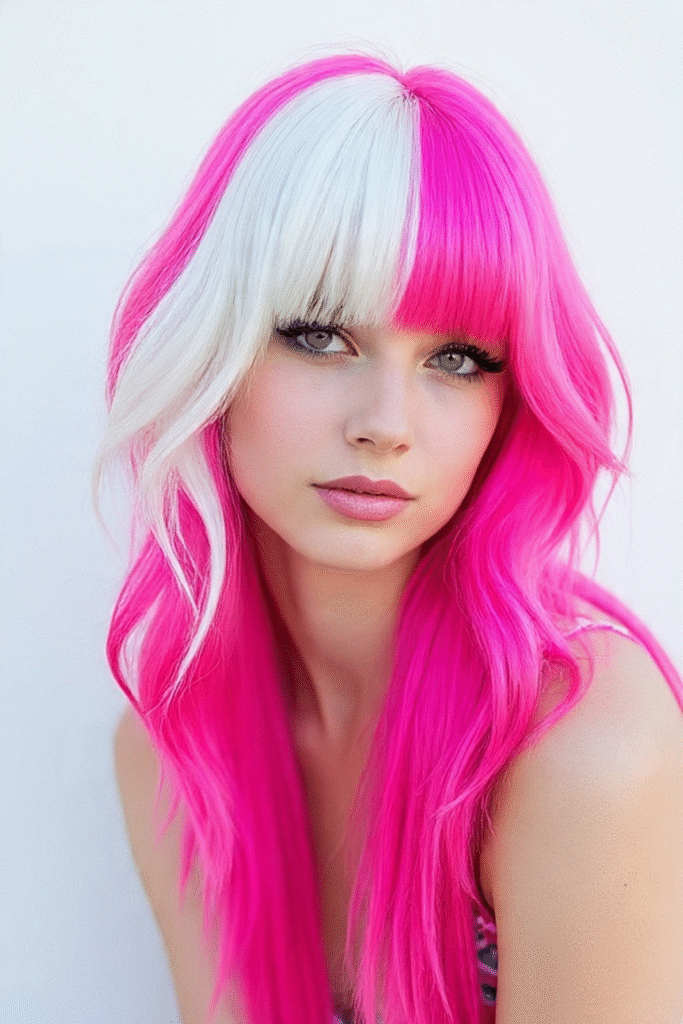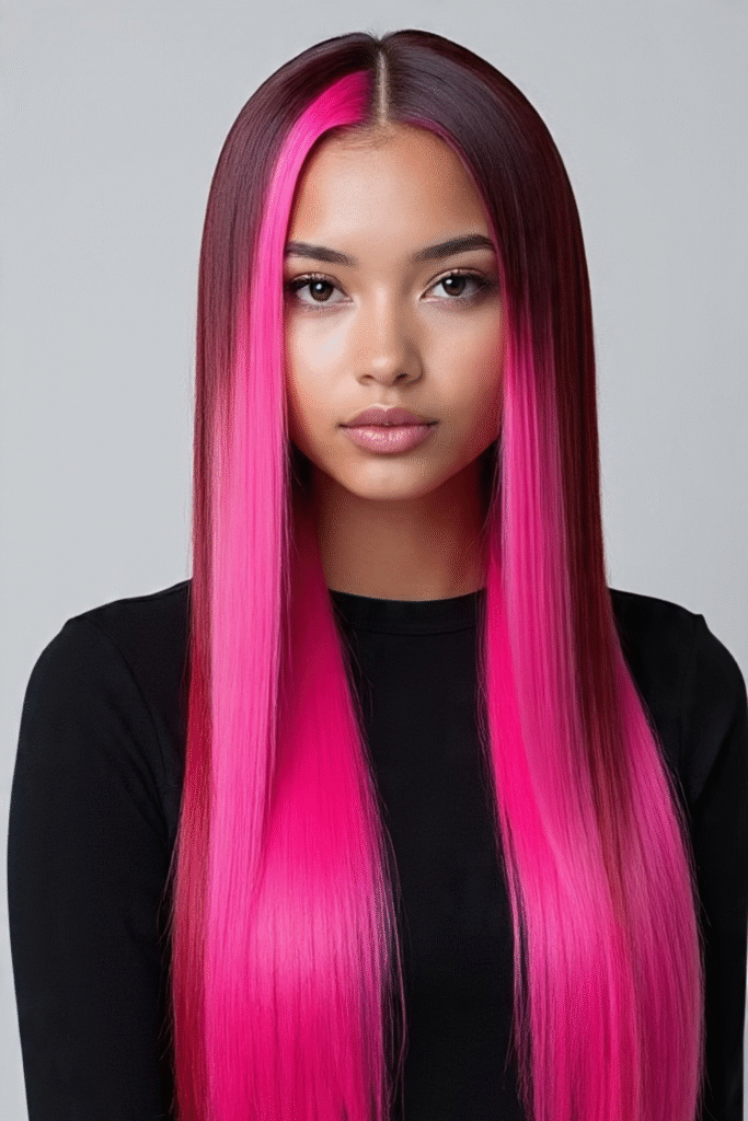 Wer hätte gedacht, dass Tiefrot und Kaugummi-Rosa so wunderschön zusammenarbeiten könnten? Diese auffällige Kombination funktioniert besonders gut bei langen, glatten Haaren, wo der scharfe Kontrast helle Konturen erzeugt, die das Gesicht umrahmen und schmeicheln.
