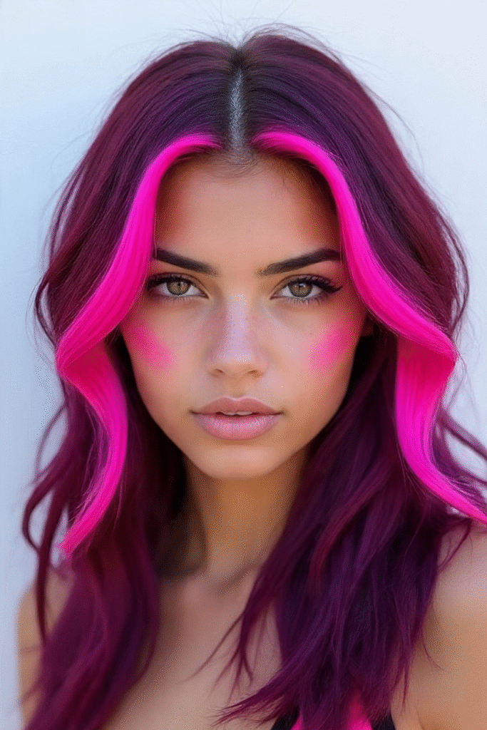 Dieser finale Stil kombiniert tiefes Magenta-Granat als Grundfarbe mit strategischen Neonrosa-Hervorhebungen, die als “Geldstücke” um das Gesicht platziert sind. Der Kontrast erzeugt unglaubliche visuelle Wirkung, während sichergestellt wird, dass das leuchtende Rosa die Aufmerksamkeit auf Ihre besten Eigenschaften lenkt.