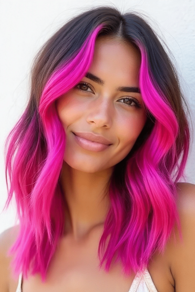Für maximale Wirkung erzeugen leuchtende rosa Strähnen auf einer dunkelbraunen Basis atemberaubenden Kontrast. Die knallrosa Hervorhebungen sind strategisch platziert, um das Gesicht zu umrahmen, Ihren Hautton zu schmeicheln und gleichzeitig eine strandige, sommerliche Atmosphäre zu schaffen.