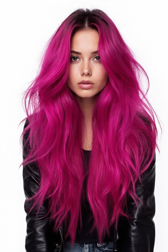 Tiefes, lebendiges Magenta erzeugt unglaubliche Fülle und Tiefe, besonders wenn es mit dunkleren Ansätzen kombiniert wird. Die glänzenden Wellen verleihen Bewegung und Dimension, während der Kontrast zwischen den dunklen Ansätzen und dem leuchtenden Magenta einen modernen, kantigen Effekt erzeugt.