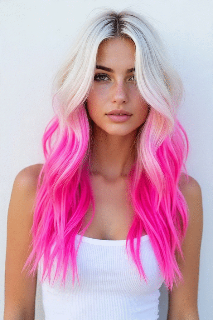 Nichts lässt Neonrosa so sehr leuchten wie eine platinblonde Basis. Diese kontrastreiche Kombination erzeugt maximale Wirkung, wobei die reine Helligkeit des Platins die warme Intensität des Neonrosa abkühlt.