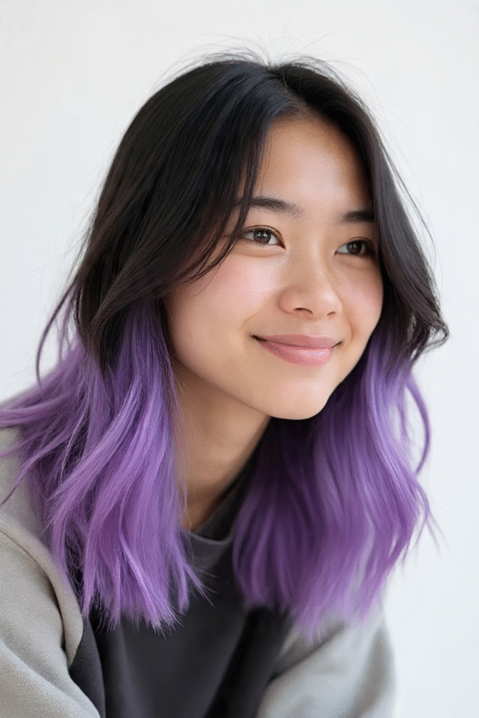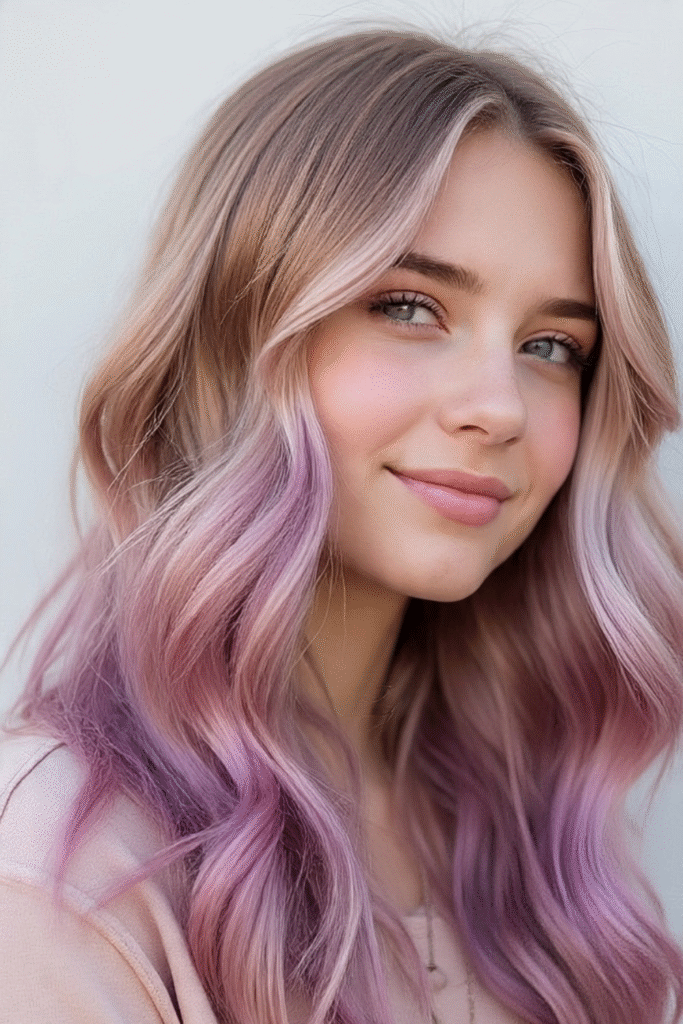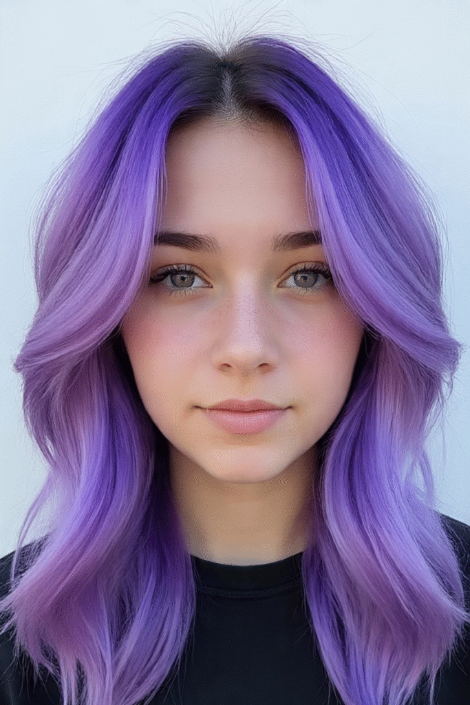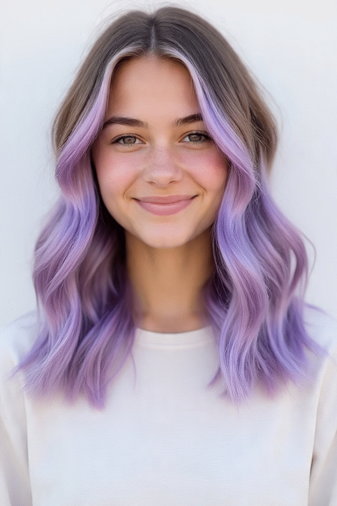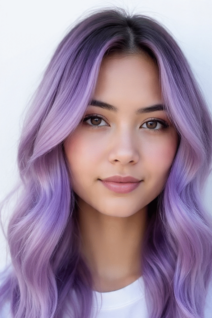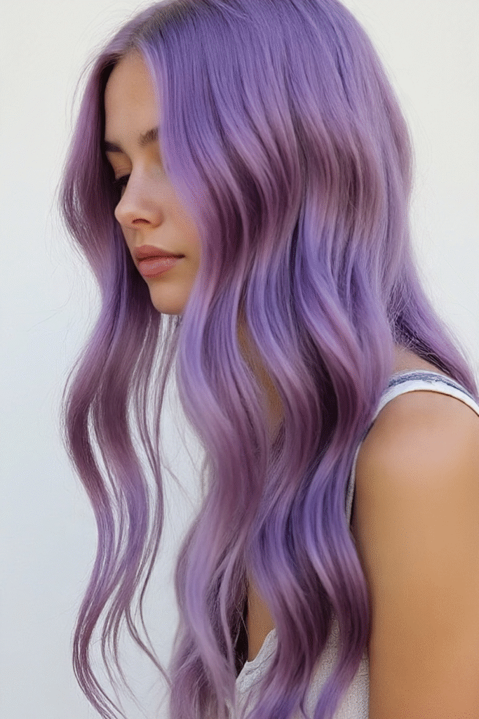 Sanfte, fließende Wellen mit Lavendelnuancen verleihen einen märchenhaften, meerjungfrauenartigen Look. Dunklere Ansätze sorgen für Tiefe und einen weichen Farbverlauf – schön und gleichzeitig pflegeleicht.