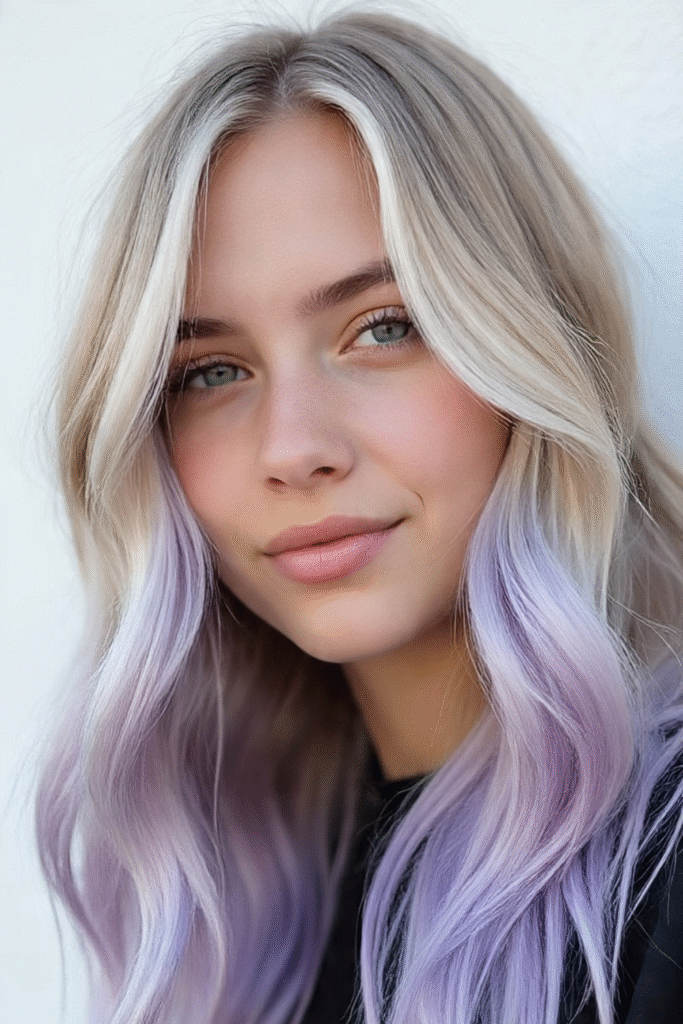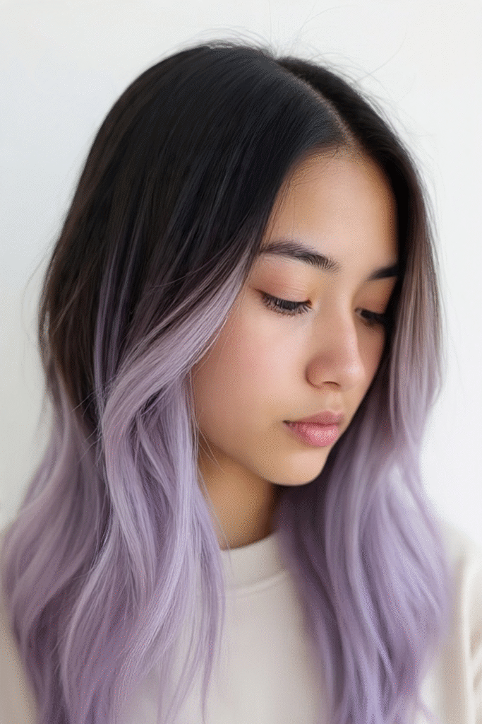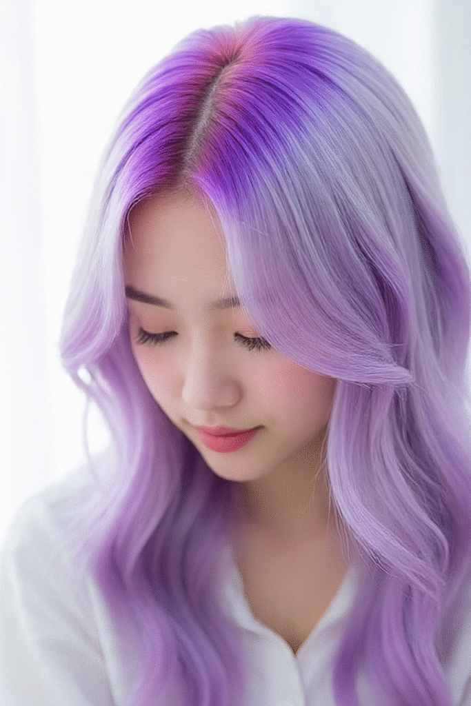 Kräftiges Lavendel am Ansatz, das zu fast weißem Pastell an den Spitzen ausläuft – dieser sanfte Übergang wirkt wie aus einer Fantasiewelt.