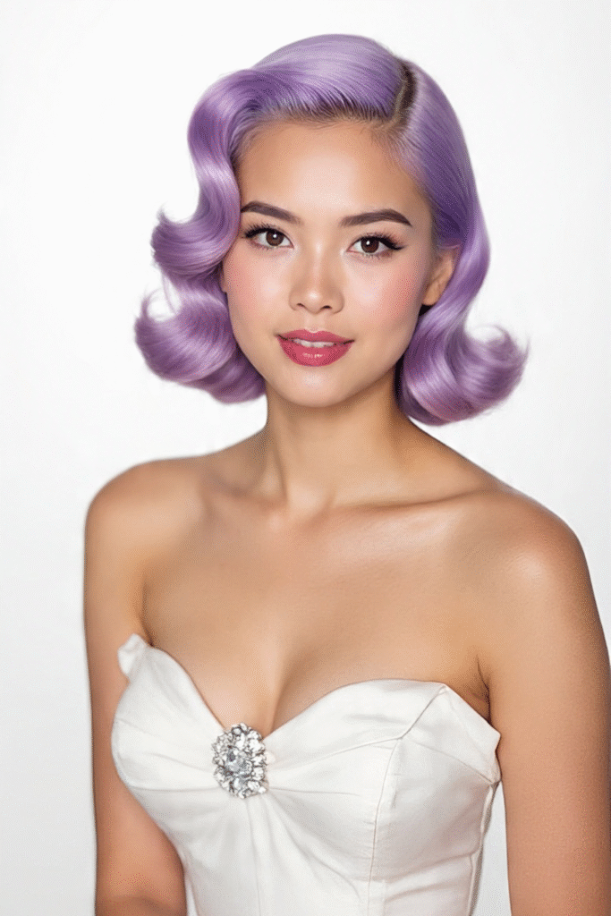 Ein glatter Bob mit Lavendelfarbe, tiefem Seitenscheitel und nach innen geföhnten Spitzen – glamourös mit einem Hauch Vintage.