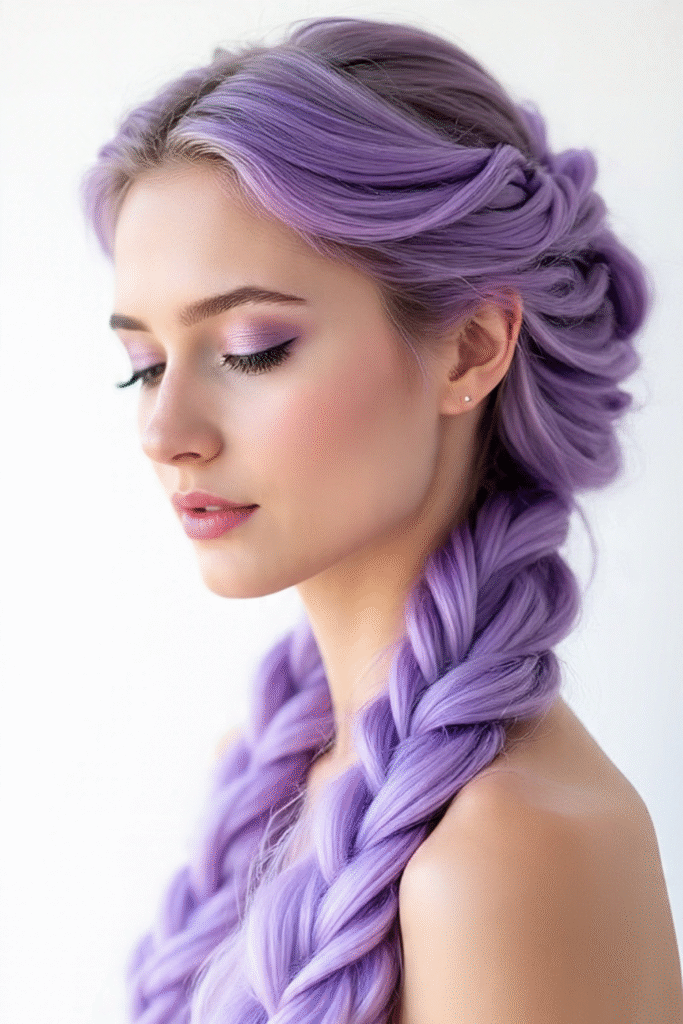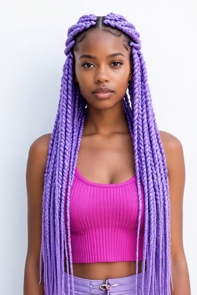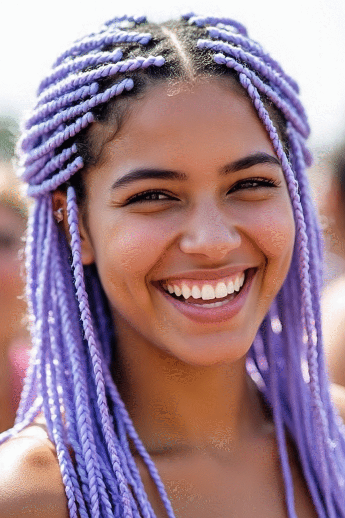 Vollständig lavendelfarbene Flechtfrisuren setzen ein starkes Statement und eignen sich gut für schützende Styles.