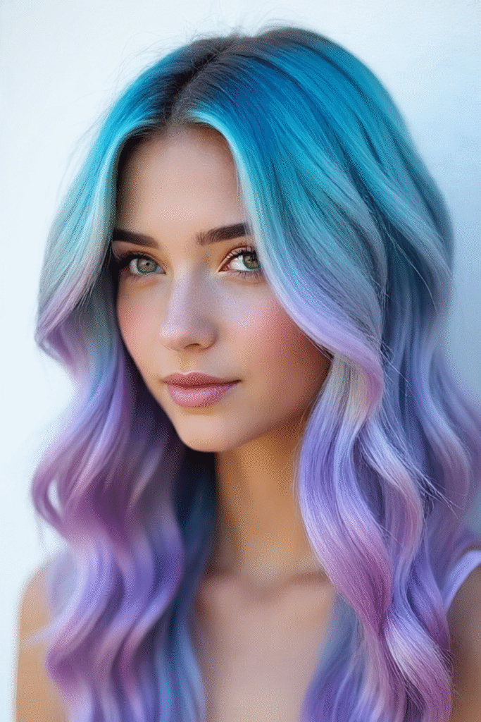 Ein Verlauf von tiefem Ozeanblau am Ansatz zu Pastelllavendel an den Spitzen – perfekt für einen Meerjungfrauen-Look.