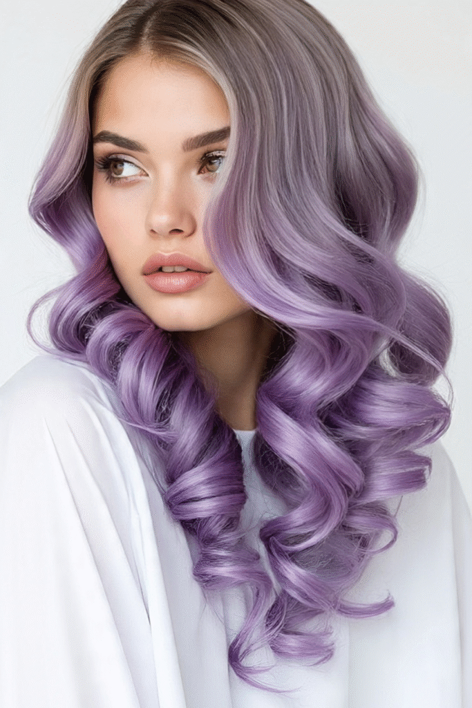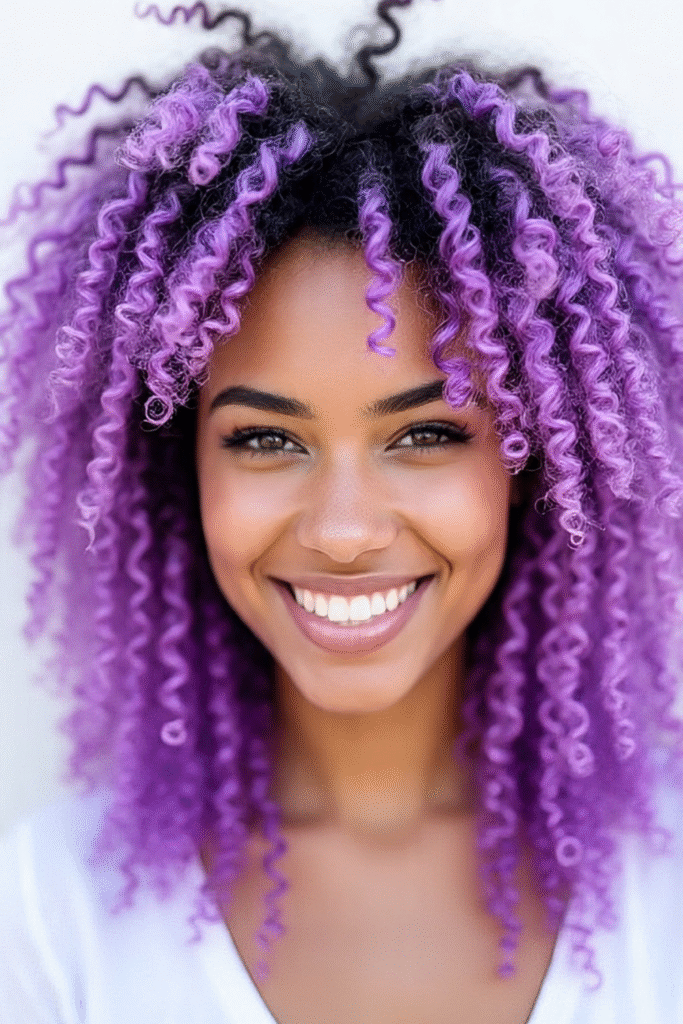Bei natürlicher Lockenpracht wirkt der Kontrast zwischen dunkleren Ansätzen und leuchtenden Lavendel-Längen besonders intensiv. Ein feuchtigkeitsspendendes Leave-in-Produkt hält die Locken nach dem Färben glänzend und gesund.